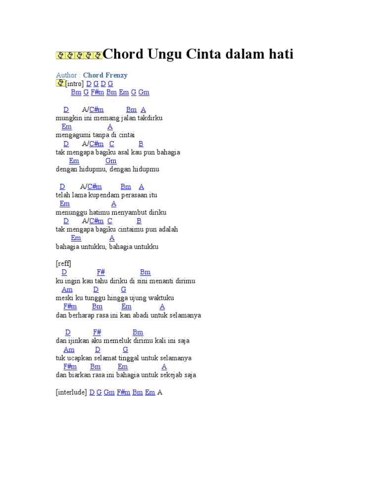 Chord Gitar Chord Gitar dan Lirik Cinta Dalam Hati - Ungu Ku Ingin Kau Tahu Diriku Disini Menanti Dirimu Berikut Chord Gitar dan Lirik Lagu Cinta Dalam Hati yang dipopulerkan oleh Ungu. D F Bm Ku ingin kau tahu diriku di sini menanti dirimu. Am D G Meski ku tunggu hingga ujung waktuku.