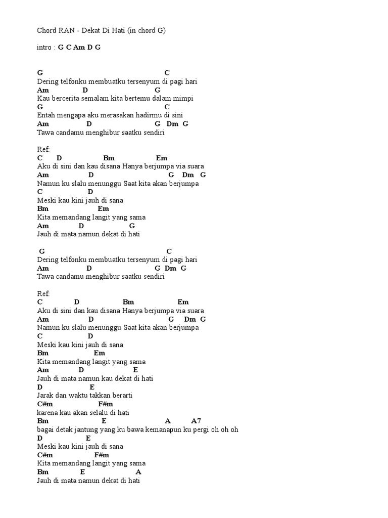 Meski kau kini jauh di sana Kita memandang langit yang sama Jauh di mata namun dekat di hati Dering teleponku membuatku tersenyum di pagi hari Tawa candamu menghibur saatku sendiri Aku di sini dan kau. Chord Kunci Gitar Ran Dekat Di Hati. There is no strumming pattern for this song yet.