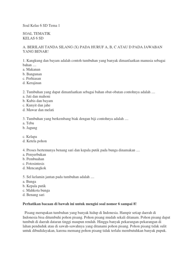 Soal K13 Kelas 6 Sd Tema 1 Subtema 1 Tumbuhan Sahabatku Dan Kunci Jawaban Pdf